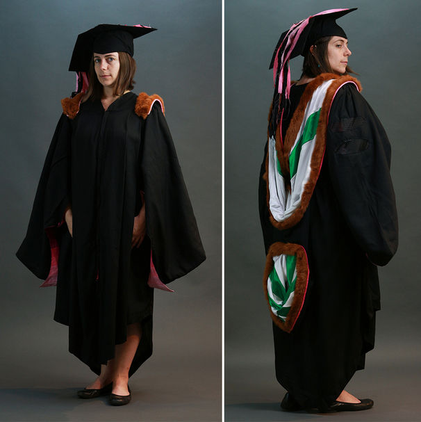 THE REGALIA PROJECT is a contemporary and feminist update of academic regalia by artist and Willamette University (Salem, Oregon, USA) assistant professor of art Cayla Skillin-Brauchle. Skillin-Brauchle identifies as many things: artist as absurdist, artist as activist, artist as feminist, artist as facilitator of creative expression and inventive problem-solving. Therefore she sees her physical presence within the academy as an opportunity to reflect upon and discuss the realities and aspirations of her academic community and, as evidenced in this project, have fun. As an ongoing performance, this garment will be edited yearly.